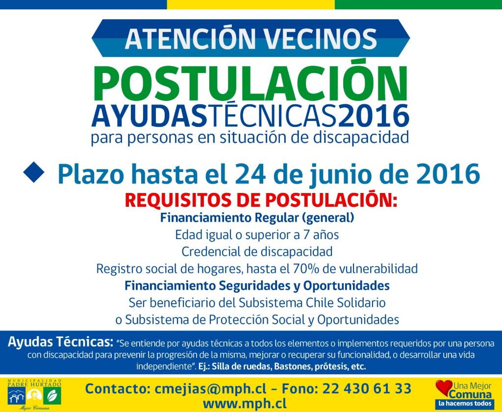La solicitud de Ayudas Técnicas sólo se recibe a través del Sistema de Postulación y se realiza en la Oficina de Programas Sociales, de nuestro edificio consistorial.