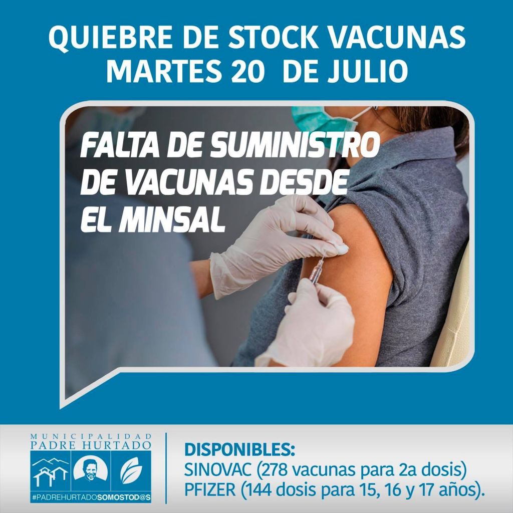 Por falta de suministro de vacunas desde el MINSAL, nuestra comuna sufrirá un quiebre de stock para este martes 20 de julio. Contamos con las siguientes vacunas: SINOVAC (Disponible 278 vacunas para segundas dosis) PFIZER (144 dosis para 15, 16 y 17 años). Más información sobre nuevo stock de vacunas, avisaremos oportunamente en nuestras redes sociales.