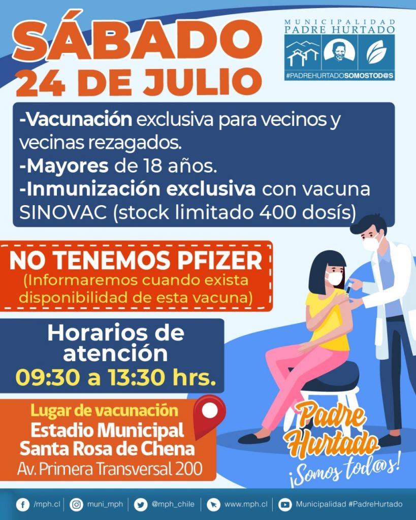 VACUNACIÓN SÁBADO 24 DE JULIO 0 By comunicaciones on julio 23, 2021 · Noticias -Exclusivamente para rezagados -Mayores de 18 años -Disponemos de 400 dosis de SINOVAC -No hay stock de PFIZER -Atencion de 9.30 a 13.30 horas (Disponibilidad de Vacunas avisaremos diariamente por redes sociales) #YoMeVacuno #PadreHurtadoSomosTodos Compartir. Twitter Facebook Google+ Pinterest LinkedIn Tumblr Email
