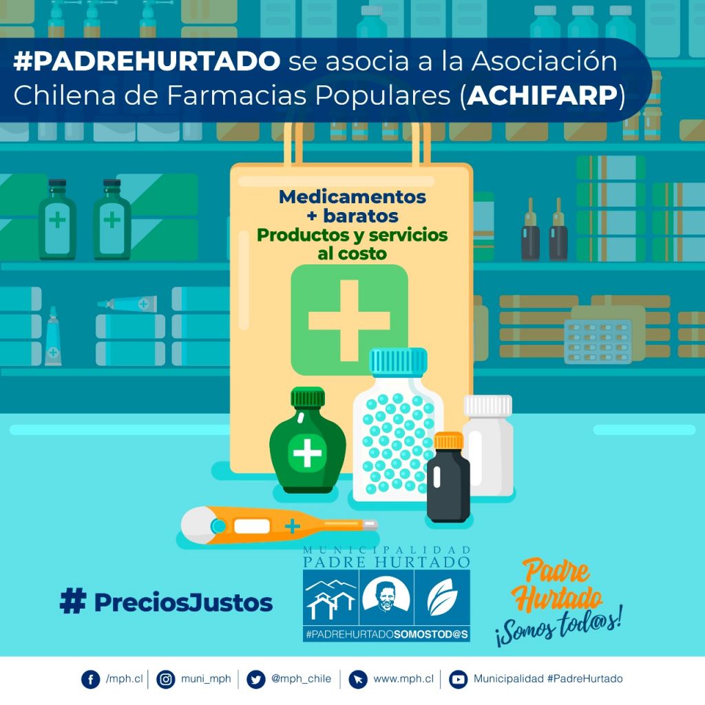 Hoy el alcalde Felipe Muñoz Heredia y el Concejo Municipal aprobaron por unanimidad asociar a nuestra comuna a la Asociación Chilena de Farmacias Populares (ACHIFARP), que además de permitirnos entregar medicamentos a precio de costo y mantener un stock permanente de estos, también nos permitirá acceder para todas las vecinas y vecinos de #PadreHurtado a dispositivos médicos, óptica, suplementos alimenticios, productos de belleza e higiene, asistencia técnica, pañales y un sinnúmero de productos a precios justos. Para nuestro alcalde esto es una excelente noticia: “Asociarnos a la ACHIFARP nos permitirá habilitar a la brevedad posible nuestra farmacia popular a precios de costo y generar un stock permanente, además de poner un catálogo de productos y servicios que beneficiarán a todos los vecinos y vecinas de la comuna. Esto es una gran noticia”.