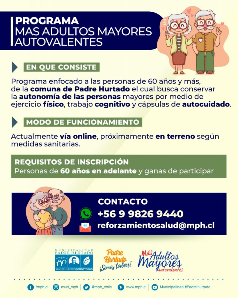 Este programa está enfocado a las personas de 60 años y más de nuestra comuna, para ayudar a conservar la autonomía de las personas mayores por medio de ejercicio físico, trabajo cognitivo y cápsulas de autocuidado.