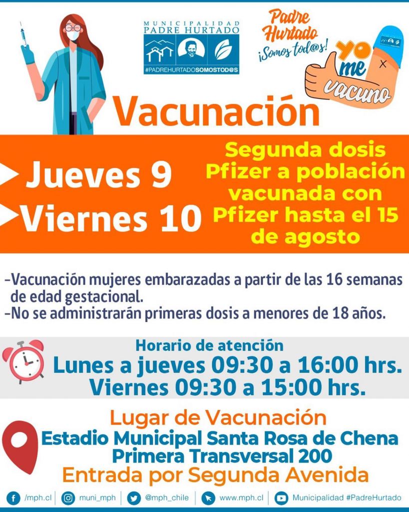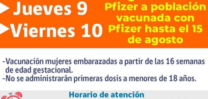 Segunda dosis de Pfizer a población vacunada hasta el 15 de agosto.
