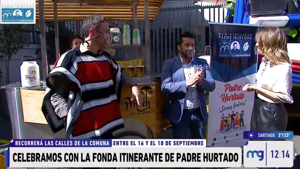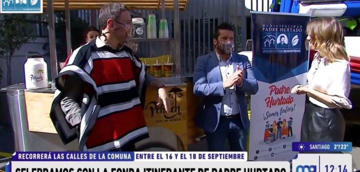 Un pequeño adelanto de la Fonda Itinerante de Padre Hurtado presentó nuestro alcalde Felipe Muñoz Heredia en el matinal “Mucho Gusto” del canal MEGA, esta mañana junto al grupo folclórico Mal Paso, cuequeros del grupo “Reminescencia” y de talleres folclóricos comunales. También nuestro jefe municipal disfrutó junto a Diana Bolocco y José Antonio Neme de un rico mote con huesillos “PEHUÉN” que gentilmente nos acompañó hasta este entretenido segmento de fiestas patrias.