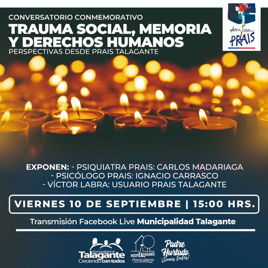 Te invitamos al conversatorio TRAUMA SOCIAL, MEMORIA Y DERECHOS HUMANOS que organiza el Hospital de Talagante a través del PRAIS (Programa de Reparación y Atención Integral en Salud y Derechos Humanos).