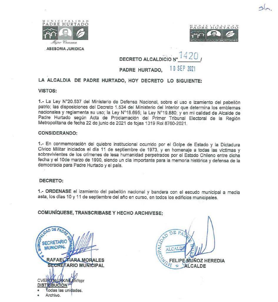 Con el objetivo de conmemorar y resguardar la memoria histórica de nuestro país, nuestro alcalde Felipe Muñoz ha firmado un decreto que establece los días 10 y 11 de septiembre como una fecha relevante para los derechos humanos y la defensa de la democracia en Chile y en nuestra comuna de Padre Hurtado. De esta manera, el jefe comunal ha establecido bandera a media asta en los edificios institucionales de la comuna.