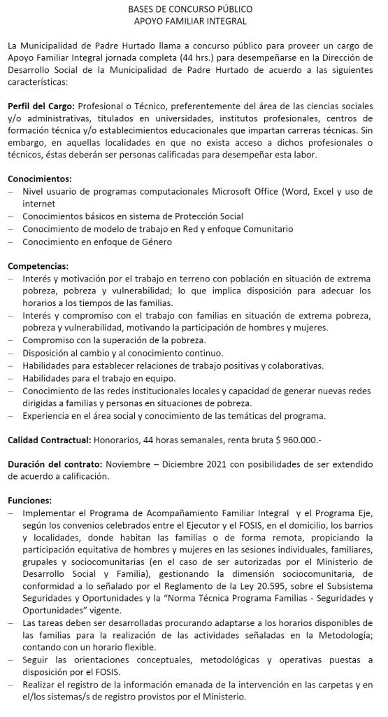 BASES DEL CONCURSO PÚBLICO APOYO FAMILIAR INTEGRAL 0 By Sergio Cardenas on octubre 25, 2021 · Noticias Compartir. Twitter Facebook Google+ Pinterest LinkedIn Tumblr Email