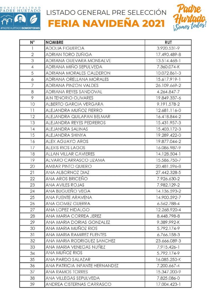 LISTADO PRESELECCIONADOS FERIA NAVIDEÑA 2021