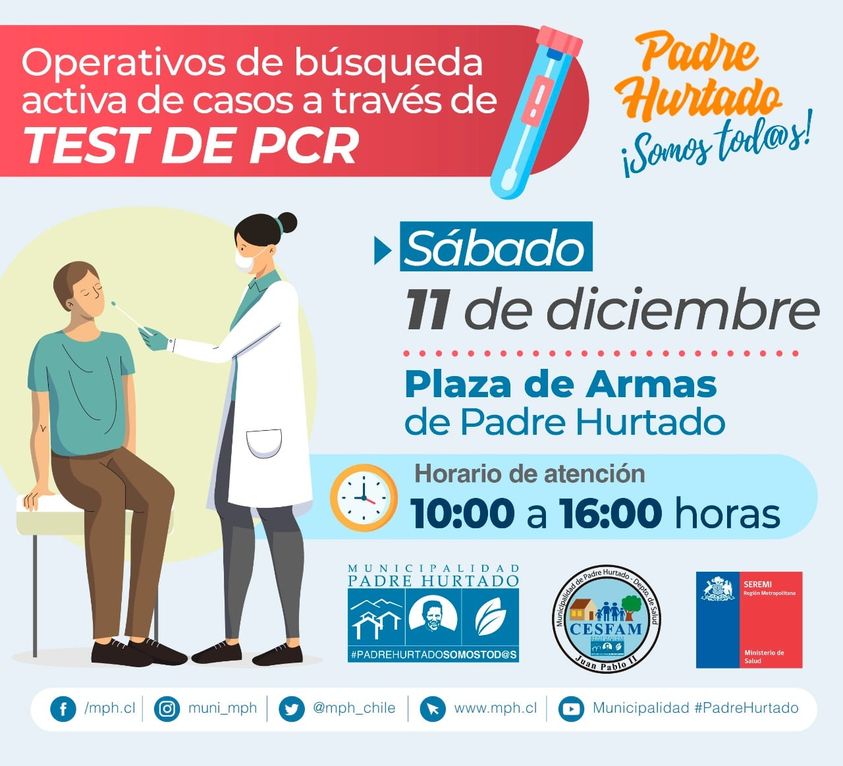 SABADO 11 DE DICIEMBRE: OPERATIVO BÚSQUEDA ACTIVA DE CASOS A TRAVÉS DE 0 By roberto rodriguez on diciembre 10, 2021 · Campañas, Salud, Sector Rural, Vecinos y Vecinas PLAZA DE ARMAS DE PADRE HURTADO 10.00 A 16.00 HORAS #PadreHurtadoSomosTodos Compartir. Twitter Facebook Google+ Pinterest LinkedIn Tumblr Email