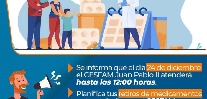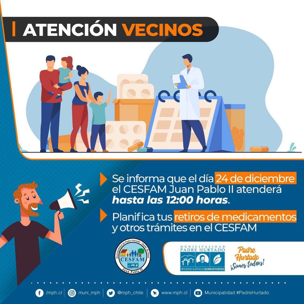 CESFAM JUAN PABLO ll Horario 24 de Diciembre 0 By roberto rodriguez on diciembre 22, 2021 · Alcaldía, Salud, Vecinos y Vecinas ATENCIÓN VECINOS !! Se informa que día 24 d diciembre el CESFAM JUAN PABLO ll atenderá hasta las 12:00 horas. Planifica tus retiros de medicamentos y otros trámites en el CESFAM. #PadreHurtadoSomosTodos Compartir. Twitter Facebook Google+ Pinterest LinkedIn Tumblr Email