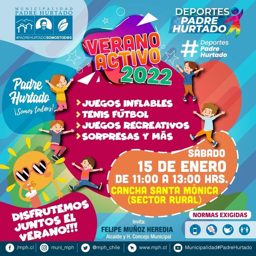Puede ser una imagen de una o varias personas y texto que dice "PADRE PALID HURTADO #PADREHURTADOSOMOSTOD@S DEPORTES PADRE HURTADO VECTINO AC # Hurtado Deportes Padre 2022 Padre Hurtado iSomos todos! >JUEGOS INFLABLES TENIS FÚTBOL JUEGOS RECREATIVOS SORPRESAS Y MÁS SÁBADO 15 DE ENERO DE 11:00 A 13:00 HRS. ICANCHA SANTA MONICA (SECTOR RURAL) DISFRUTEMOS DISFRUTEMOS JUNTOS VERANO!!! EL Invita: FELIPE MUÑOZ HEREDIA Alcalde H. Concejo Municipal /mph.cl muni_mph NORMAS EXIGIDAS @mph_chile www.mph.cl Municipalidad#PadreHurtado"