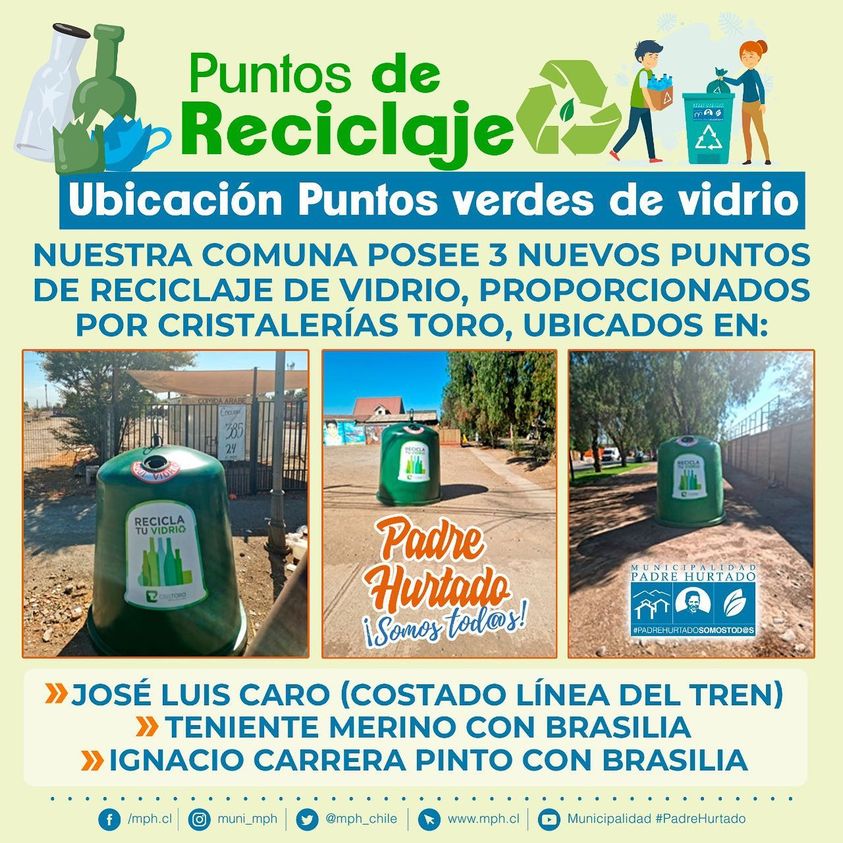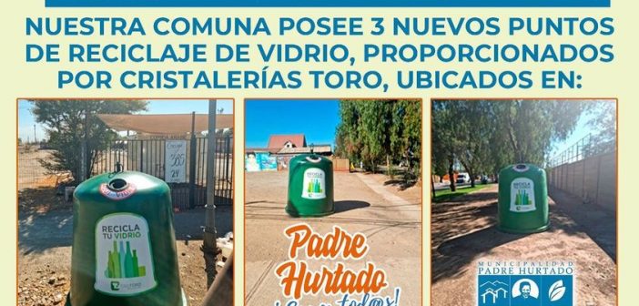 NUEVOS PUNTOS DE RECICLAJE DE VIDRIO 0 By roberto rodriguez on enero 26, 2022 · Cartelera, Vecinos y Vecinas NUEVOS PUNTOS DE RECICLAJE DE VIDRIO. Nuestra comuna posee 3 nuevos puntos de reciclaje de vidrio, proporcionados por Cristalerías Toro, ubicados en: -Teniente Merino con Brasilia – José Luis Caro (Costado línea del Tren) – Ignacio Carrera Pinto con Brasilia #PadreHurtadoSomosTodos Compartir. Twitter Facebook Google+ Pinterest LinkedIn Tumblr Email