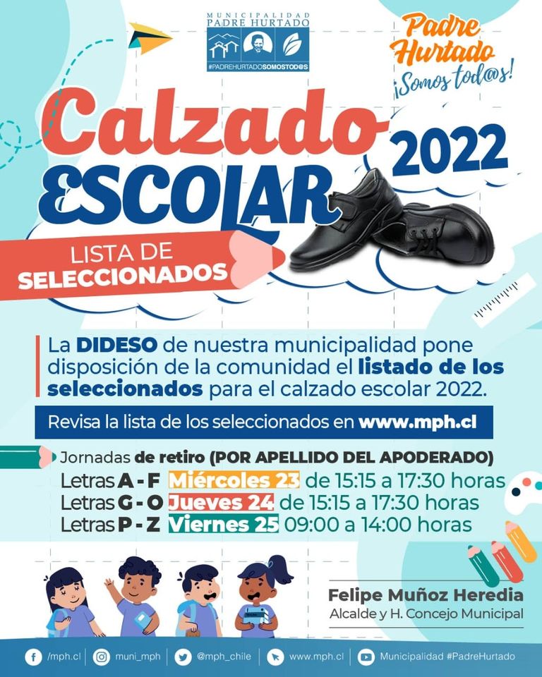Puede ser una imagen de calzado y texto que dice "PADRE HURTADO Padre #PADREHURTADOSOMOSTODOS Hurtado Calzado 2022 ¡Somos todos! ESCOLAR LISTA DE SELECCIONADOS የ La DIDESO de nuestra municipalidad pone disposición de la comunidad el listado de los seleccionados para el calzado escolar 2022. Revisa la lista de los seleccionados en www.mph.cl Jornadas de retiro (POR APELLIDO DEL APODERADO) Letras Miércoles2 de 15:15 a 17:30 horas Letras Jueves de 15:15 a 17:30 horas Letras -z Viernes 25 09:00 a 14:00 horas /mph.cl muni_mph Felipe Muñoz Heredia Alcalde H. Concejo Municipal @mph_chile www.mph.cl Municipalidad #PadreHurtado"