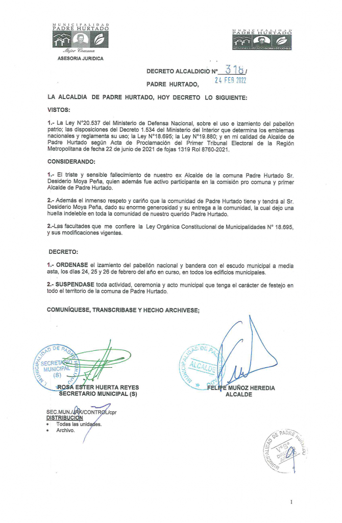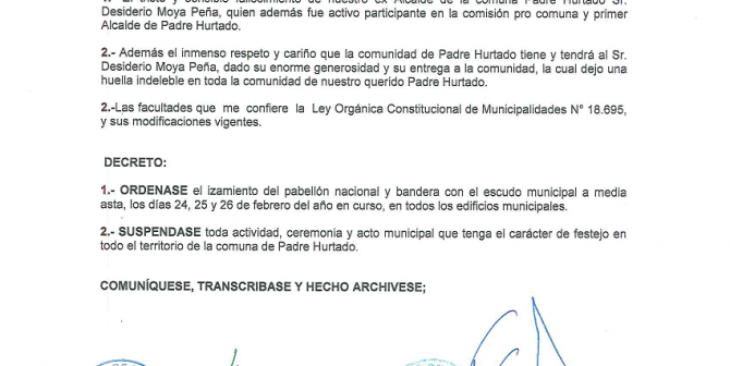 DECRETO ALCALDICIO DUELO COMUNAL POR FALLECIMIENTO DE DESIDERIO MOYA PEÑA 0 By Sergio Cardenas on febrero 24, 2022 · Alcaldía, Noticias Compartir. Twitter Facebook Google+ Pinterest LinkedIn Tumblr Email