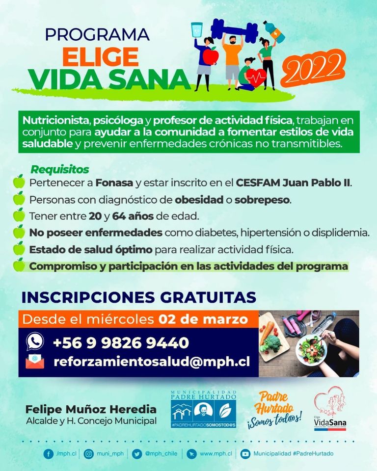 El programa elige vida sana los invita a inscribirse y participar de las distintas actividades que ofrece este programa, para mejorar la salud y prevenir enfermedades crónicas no transmisibles.