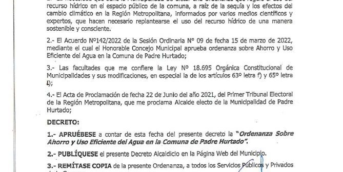 ORDENANZA SOBRE USO EFICIENTE DEL AGUA EN LA COMUNA DE PADRE HURTADO 0 By Sergio Cardenas on abril 11, 2022 · Alcaldía, Campañas, Cartelera DESCARGUE AQUÍ LA ORDENANZA: Ordenanza Sobre Ahorro y uso Eficiente del Agua Compartir. Twitter Facebook Google+ Pinterest LinkedIn Tumblr Email