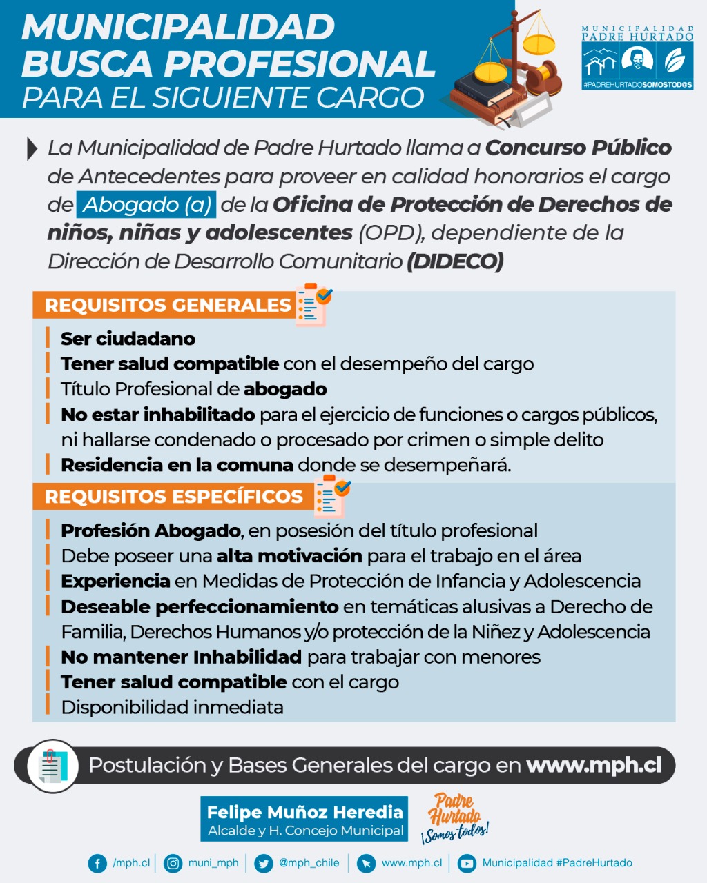 La Municipalidad de Padre Hurtado llama a Concurso Público de Antecedentes para proveer en calidad honorarios el cargo de Abogado (a) de la Oficina de Protección de Derechos de niños y niñas y adolescentes (OPD), dependiente de la Dirección de Desarrollo Comunitario (DIDECO).