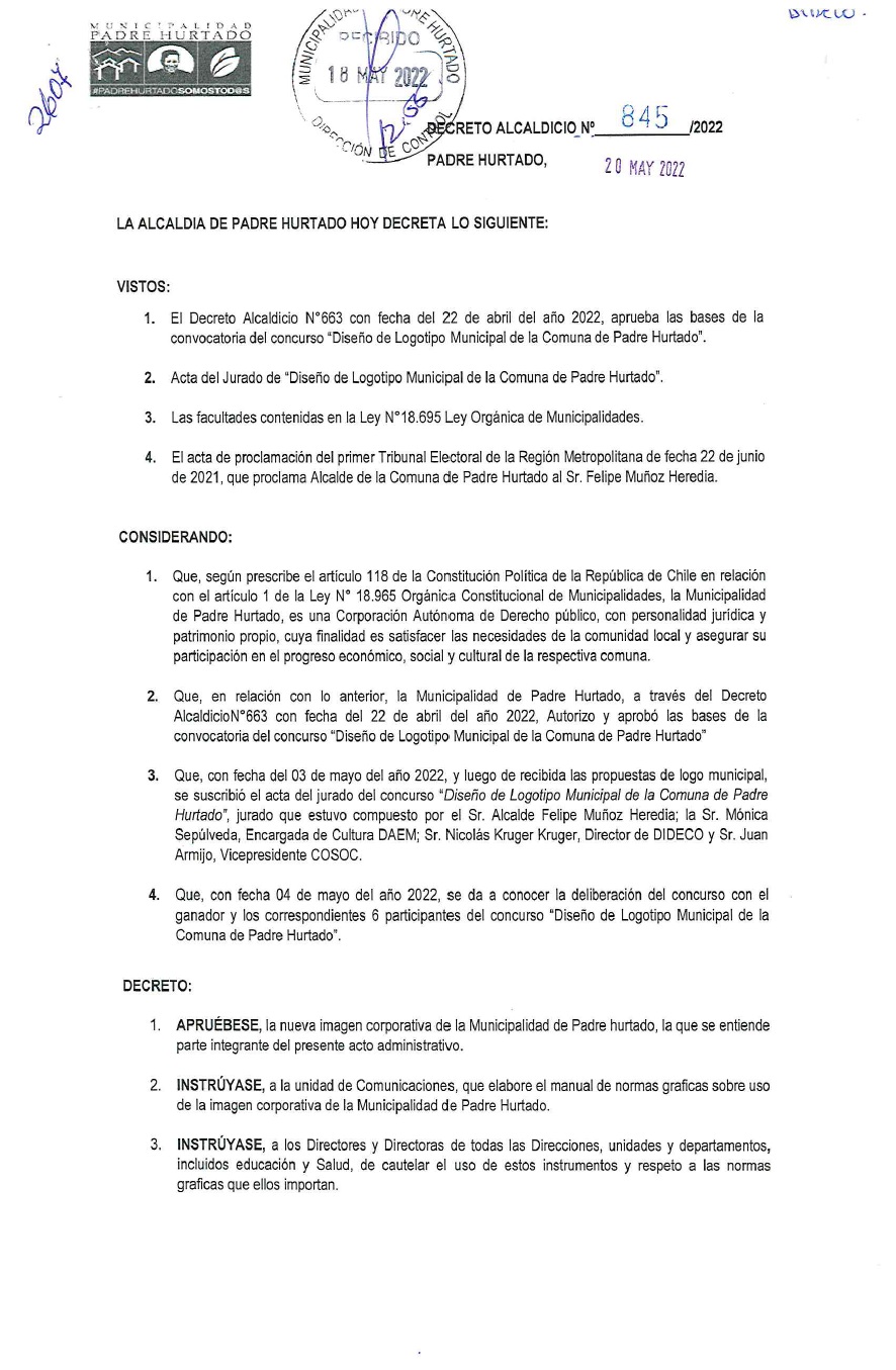 Se adjunta el Decreto Edilicio respecto a la nueva imagen corporativa de la Municipalidad de Padre Hurtado, para descargar aquí
