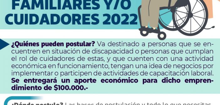 ¿Quiénes pueden postular? Va destinado a personas que se encuentren en situación de discapacidad o personas que cumplan el rol de cuidadores de estas, y que cuenten con una actividad económica en funcionamiento, tengan una idea de negocios por implementar o participen de actividades de capacitación laboral. Se entregará un aporte económico para dicho emprendimiento de $100.000.-