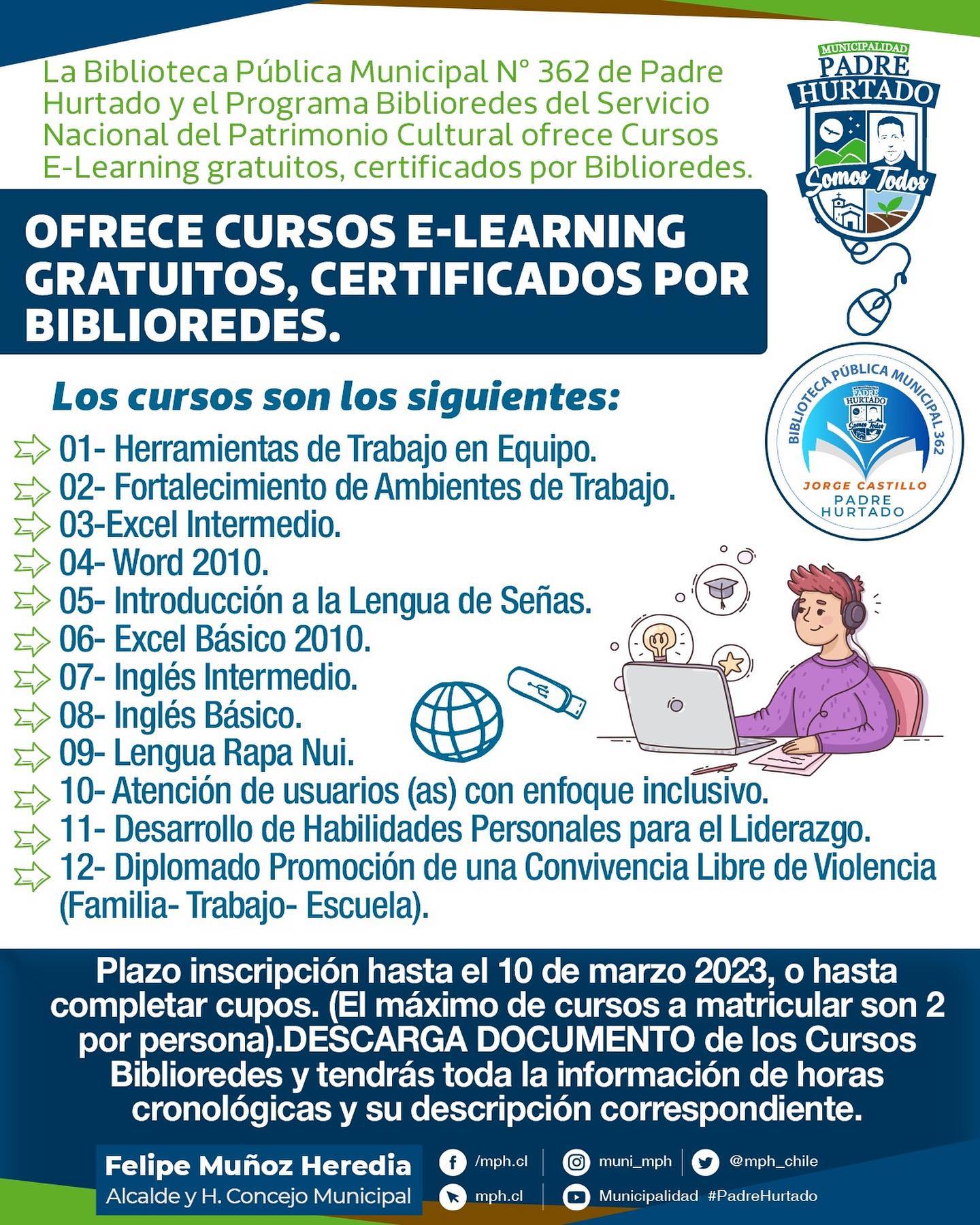 Vecinas y vecinos, la biblioteca municipal de Padre Hurtado y el Programa de Biblioredes ofrece los siguientes cursos gratuitos para la comunidad.
