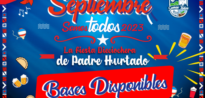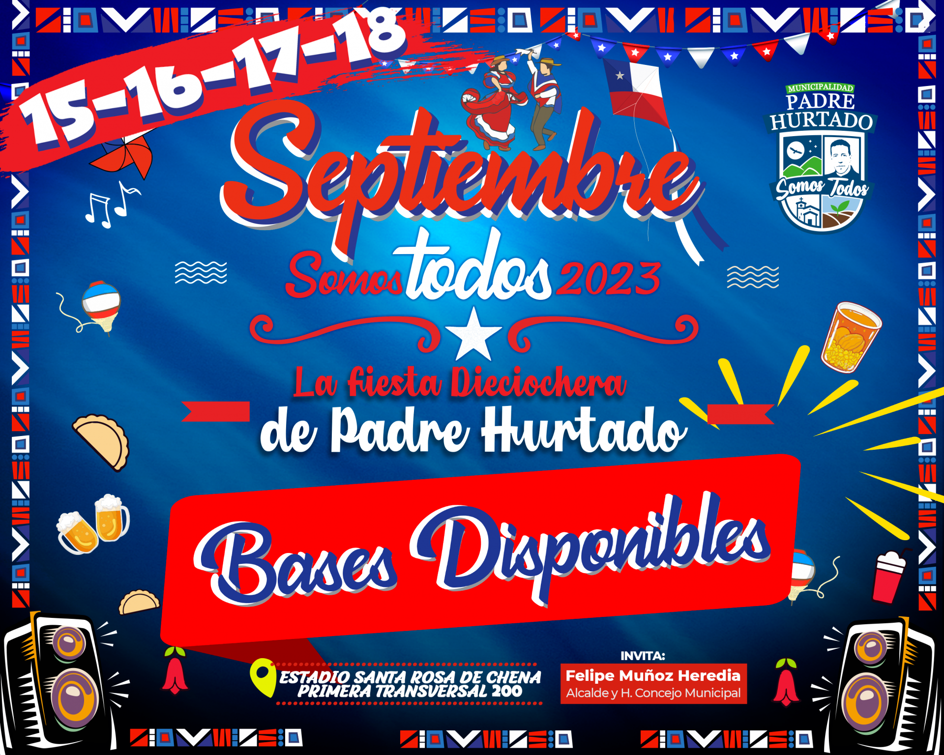 Vecinas y vecinos, les informamos que se encuentran disponible la modificación, aclaratoria, plano y las bases para el remate de nuestra fonda “SEPTIEMBRE SOMOS TODOS. LA FIESTA DIECIOCHERA DE PADRE HURTADO 2023”, que se llevará a cabo los días 15, 16, 17, 18 de septiembre en el Estadio de Santa Rosa de Chena, ubicado en Primera Transversal #200, comuna de Padre Hurtado.
